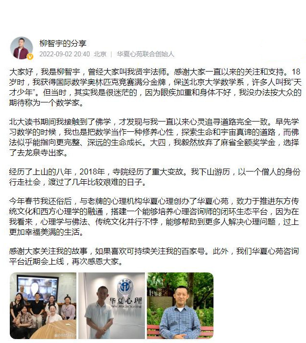 为了更好地帮助他人,柳智宇从2015年开始学习心理学,试图把佛教和心理学结合起来。2017年底,他考取了三级心理咨询师执照,大半年后,开通了一项“佛系心理咨询”,形式是在微信上文字交谈,每次1个小时。